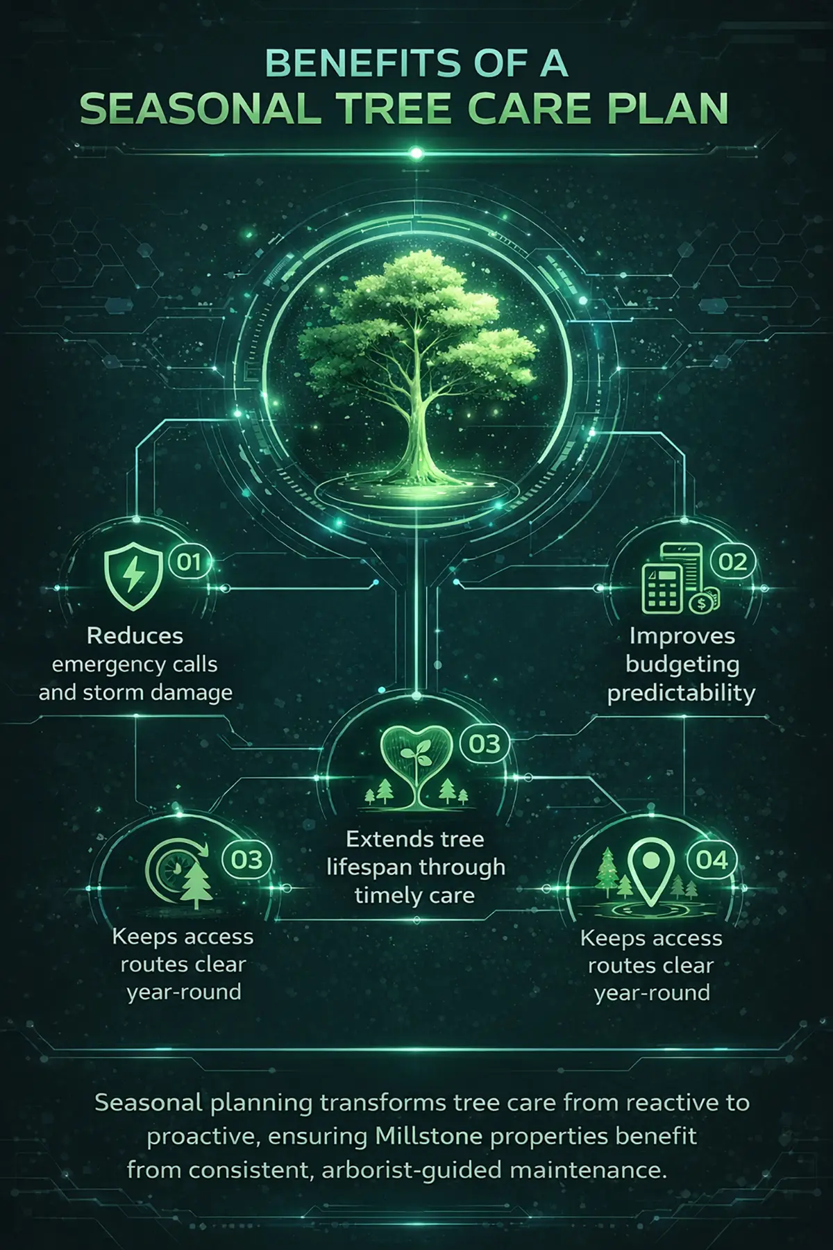 Seasonal planning transforms tree care from reactive to proactive. Millstone properties benefit from consistent, arborist-guided maintenance.
