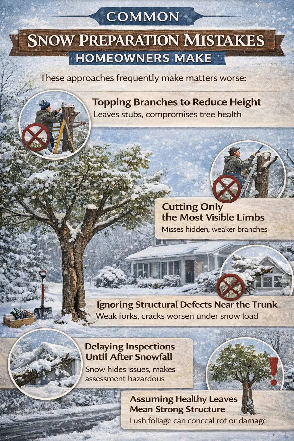 We also see homeowners focus only on visible branches while ignoring root and trunk health. Snow failures often begin below ground.